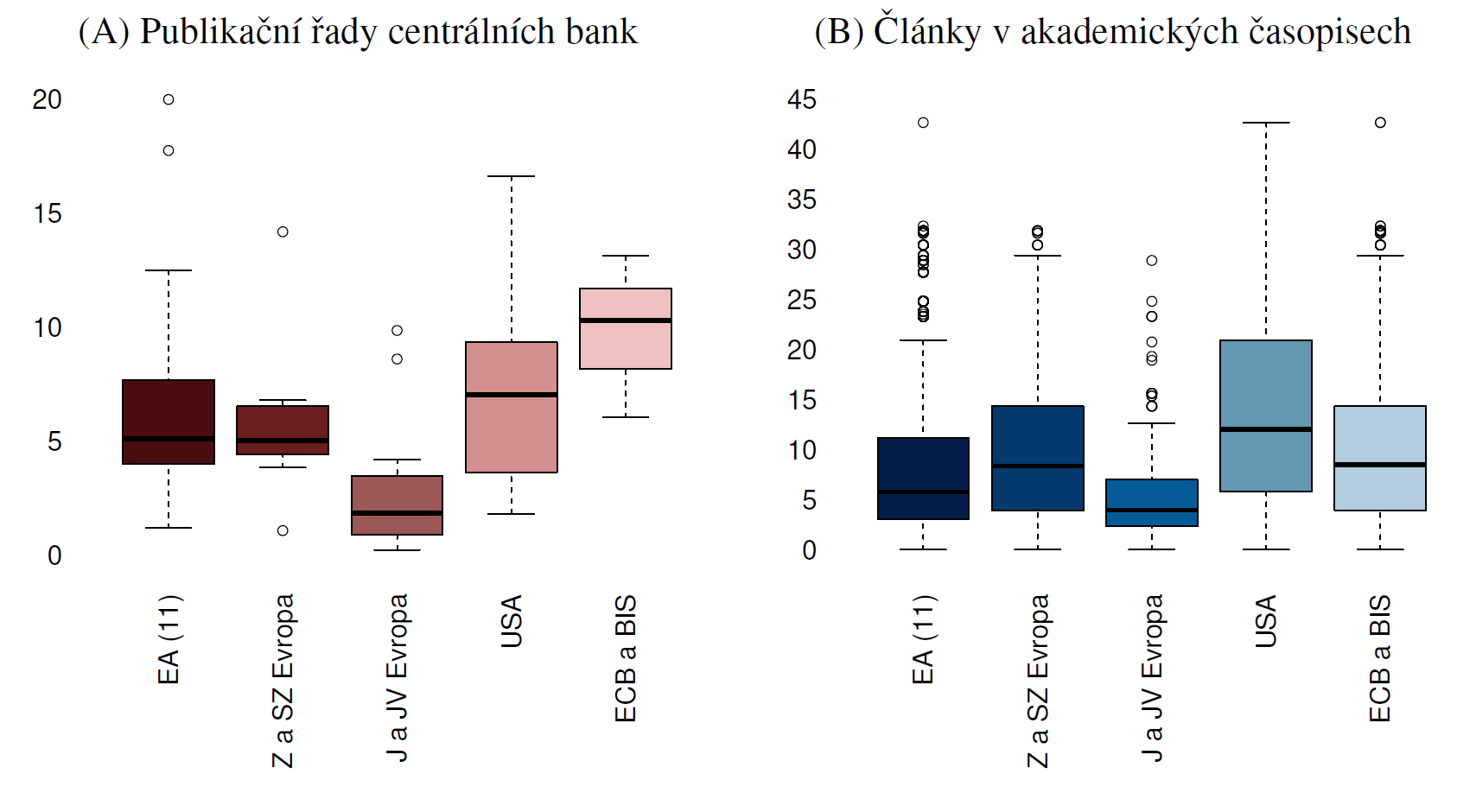 Výzkum v centrálních bankách má přidanou hodnotu v několika dimenzích. Může pomoci při řešení aktuálních palčivých otázek, kterými se centrální banka musí zabývat. Má však také nezanedbatelný význam pro šíření nejnovější ekonomických poznatků uvnitř i vně instituce. Otázkou tedy není, zda v centrálních bankách výzkum provádět, ale jak ho organizovat, kolik do něj investovat a jak zajistit efektivní přenos jeho výsledků do rozhodování o hospodářské politice. Pro takovéto úvahy je potřeba mít dobrou představu o tom, jak provádějí výzkum i jiné centrální banky. Z toho důvodu jsme se rozhodli připravit přehled vybraných aspektů výzkumu v 50 evropských a amerických centrálních bankách a zkonstruovat zcela nový datový soubor o více než 20 tisících výzkumných publikacích těchto centrálních bank z posledních dvou dekád. Asi nikoho nepřekvapí, že jsme identifikovali významné rozdíly mezi jednotlivými regiony, a to nejen napříč Atlantikem, ale také v rámci Evropy. I přesto jsme dokázali nalézt některé důležité vlastnosti a trendy, které jsou pro všechny centrální banky stejné.