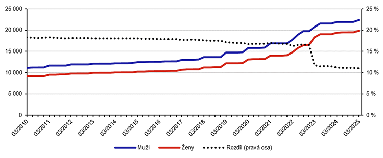Tento příspěvek reagoval na dlouhodobý rozdíl mezi výší důchodů pobíraných muži a ženami, který je dán řadou faktorů včetně dřívějšího odchodu do penze, delší doby pobírání důchodu, zátěže spojené s výchovou dětí i jinými pečujícími závazky a konečně výpočtem kopírujícím individuální příjmy. V prosinci 2023 činil rozdíl mezi průměrnými důchody mužů a žen 3 271 Kč. Důchodci tak oproti důchodkyním pobírali částku v průměru o 16,6 % vyšší (Graf 1). V březnu 2024 se rozdíl zmenšil na 2 433 Kč, tedy 11,7 %.