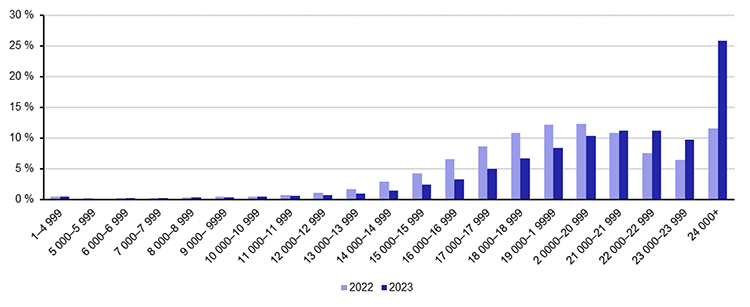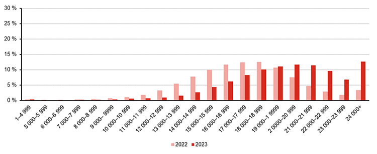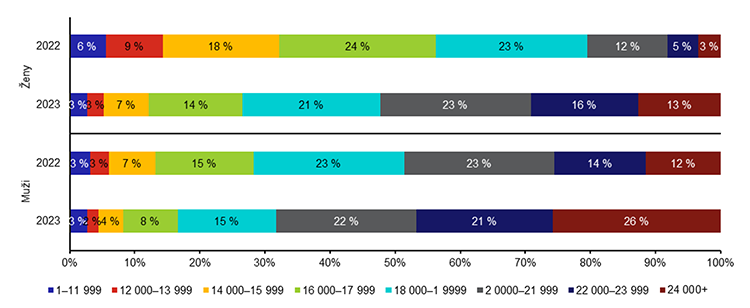 Životní úroveň penzistů nicméně nebyla během inflační vlny zasažena rovnoměrně. V roce 2022 nejméně 12,0 % starobních důchodců pobíralo částku nižší než minimální mzda po zdanění, přičemž valnou většinu (78,3 %) z této kategorie představovaly ženy. V roce 2023 se vlivem zavedení výchovného celkový podíl důchodců s důchodem menším než minimální mzda po zdanění snížil na nejméně 7,6 %, nadále ale většinu (66,7 %) příjemců takto nízkých důchodů tvořily ženy. Rozdíly v distribuci výše starobního důchodu mezi muži a ženami ilustrují i Grafy 2, 3 a 4.