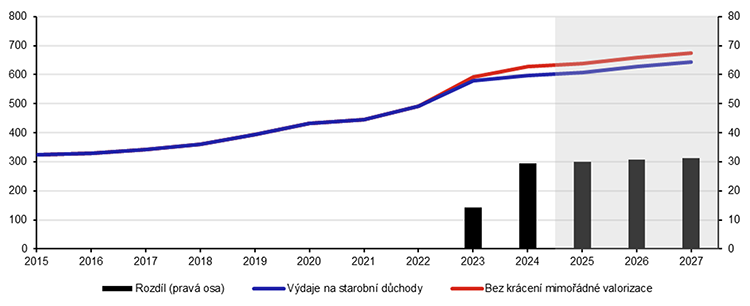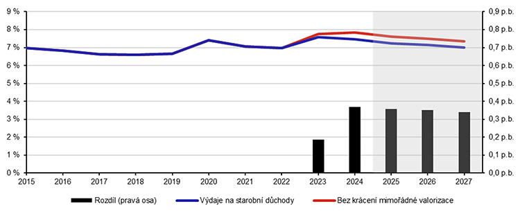 Rozdíl daný úpravou mimořádné valorizace z června 2023 se ovšem propisuje i do dalších let, neboť řádné valorizace starobních důchodů jsou počítány podle výše aktuálně pobíraných důchodů. Touto úpravou je tak každoročně uspořeno přibližně 30 mld. Kč, tj. 0,4 % HDP (Grafy 5 a 6), respektive o tolik byly sníženy výdaje na starobní důchody oproti původnímu výpočtu danému zákonem.