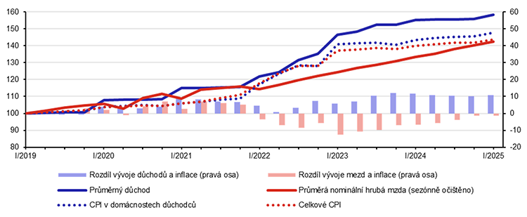 Změny v oblasti starobních důchodů v posledních letech významně ovlivnily jak výdaje státu, tak i životní úroveň samotných důchodců a důchodkyň. Zavedení výchovného přispělo (18,8 mld. Kč ročně, 0,2 % HDP) ke snížení rozdílu mezi průměrnými důchody žen a mužů. Úprava mimořádné valorizace z června 2023 naopak znamenala výraznou úsporu pro veřejné finance (přibližně 30 mld. Kč ročně, 0,4 % HDP). Navzdory tomu průměrný starobní důchod celkově od roku 2019 rostl rychleji než cenová hladina i průměrná nominální hrubá mzda. Důchodová reforma sice upravila valorizační vzorec, ale její plný dopad se projeví až v dalších letech.
