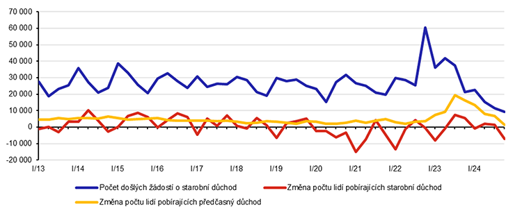 Série mimořádných valorizací vedla na konci roku 2022 k situaci, kdy za určitých okolností výpočet starobního důchodu vycházel výhodněji při odchodu do předčasného důchodu. Na tento stav upozornilo i samo Ministerstvo práce a sociálních věcí. Výsledkem byl rekordní počet žádostí o starobní důchod (Graf 9). Nejvíce jich Česká správa sociálního zabezpečení obdržela v listopadu 2022, kdy o důchod požádalo 27 952 lidí. Celkově za 4. čtvrtletí roku 2022 dorazilo 60 315 žádostí. Samotné podání žádosti ovšem neznamenalo automatický odchod do starobní penze, nýbrž pouze výpočet výše starobního důchodu, pročež se počet penzistů v 1. čtvrtletí roku 2023 dokonce propadl o 7 900 lidí. V celkovém počtu důchodců se vlna žádostí projevila nejvíce ve 3. čtvrtletí roku 2023, kdy počet lidí pobírajících předčasný důchod narostl o 19 475.