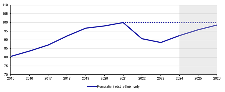 Valorizační vzorec má dvě složky: růst reálných mezd a inflaci. První změnou bylo snížení váhy růstu reálných mezd z jedné poloviny na jednu třetinu, čímž se vzorec vrátil ke svému původnímu znění, podle kterého byly důchody valorizovány naposledy v lednu 2017. V nejbližších letech se ale tato revize ve výši valorizace neprojeví. Zákon stanovuje, že dokud se reálné mzdy nevrátí na svou úroveň z roku 2021 (v Grafu 10 tečkovaně), bude do valorizačního vzorce vstupovat pouze inflace. K dorovnání by mohlo dle jarní prognózy České národní banky dojít nejdříve v roce 2027, což by se projevilo v řádné valorizaci od ledna 2029.