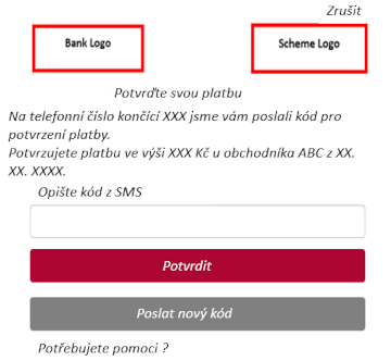 Po zadání karetních údajů a v případě, že je vyžadováno silné ověření (tzn. zadání SMS kódu a ePIN), se objeví obrazovka, kdy je držitel standardně vyzván k zadání SMS kódu, který obdrží na telefonní číslo registrované u dané debetní karty.