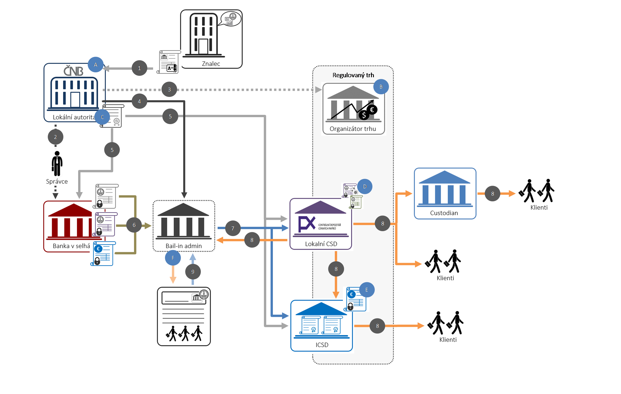 ČNB za účelem transparentnosti a předvídatelnosti kroků vedoucích k implementaci nástroje bail-in v rámci tohoto textu publikuje zjednodušený proces vedoucí k zprovoznění nástroje bail-in. ČNB při tvorbě tohoto zjednodušeného procesu vycházela jak z legislativy platné v České republice, tak z Principů pro zprovoznění nástroje bail-in vydaných Radou pro finanční stabilitu („Principles on Bail-in Execution“)[1] a spolupracovala na něm s Centrálním depozitářem cenných papírů, Burzou cenných papíru Praha a organizačními útvary ČNB vykonávající dohled a dozor nad těmito infrastrukturami finančního trhu („FMIs“). Navržený proces v maximální možné míře využívá stávajících procesů, technologií a konvencí výše zmíněných FMIs a stejně tak zohledňuje případné zapojení mezinárodních centrálních depozitářů („ICSD“), byť této problematice se ve větším detailu věnují Pokyny k výkonu Bail-in u mezinárodních dluhových cenných papírů publikované Jednotným výborem pro řešení krize („Guidance on bail-in for international debt securities“)[2].