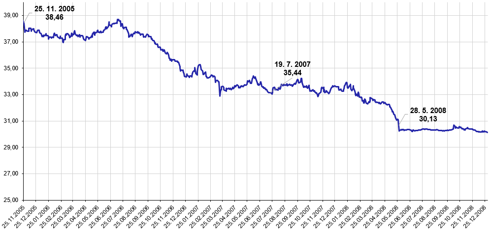 Dalším úskalím je samotný pobyt v režimu ERM II. Povolené fluktuační pásmo pro pohyb měnového kurzu bývá mylně vykládáno jako široké rozmezí +/- 15 procent. Bezpečné plnění kritéria však ve skutečnosti vyžaduje udržení devizového kurzu v intervalu +/- 2,25 procenta bez výrazného napětí. Pokud se kurz dostane mimo toto užší pásmo, dochází ze strany hodnotitelů ke zkoumání délky odchylek, jejich příčin a nastavení měnové politiky v období pohybu kurzu mimo interval. Případné intervence na udržení kurzu v úzkém rozpětí, ať již ze strany ČNB nebo ECB, už nemusí být hodnoceny jako soulad s plněním kritéria pohybu kurzu „bez výrazného napětí". Na rozdíl od plnění ostatních maastrichtských kritérií je kritérium stability kurzu zatíženo vysokou mírou subjektivity. Jasné je to, že během dvouletého období nesmí dojít k devalvaci centrální parity. Revalvace je naopak nutná v momentě, kdy se měna blíží k 15procentnímu posílení. Poučný je příklad Slovenska, které bylo nuceno revalvovat centrální paritu hned dvakrát. V listopadu 2005 Slovensko vstoupilo do ERM II s centrální paritou 38,46 SKK/EUR. Slovenská koruna do července 2007 posílila o 14 procent, proto byla parita revalvována na 35,44 SKK/EUR. Další posilování slovenské měny vedlo k další revalvaci na 30,13 SKK/EUR koncem května 2008 (viz graf).