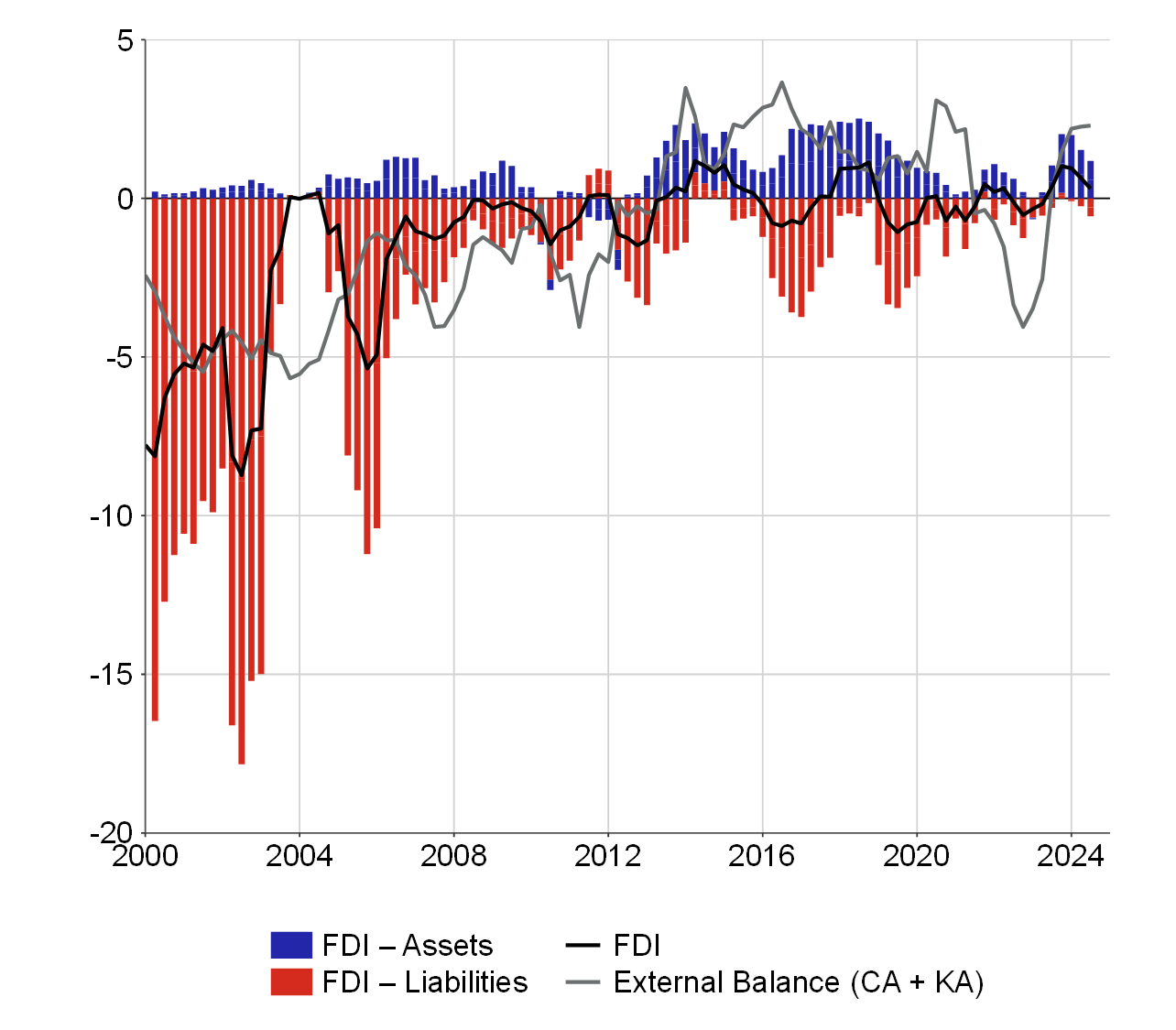 Note: Foreign direct investment (FDI) only includes new equity (excluding reinvestment and debt capital). A negative external balance means an inflow of capital, a positive balance means an outflow. CA – current account, KA – capital account.
