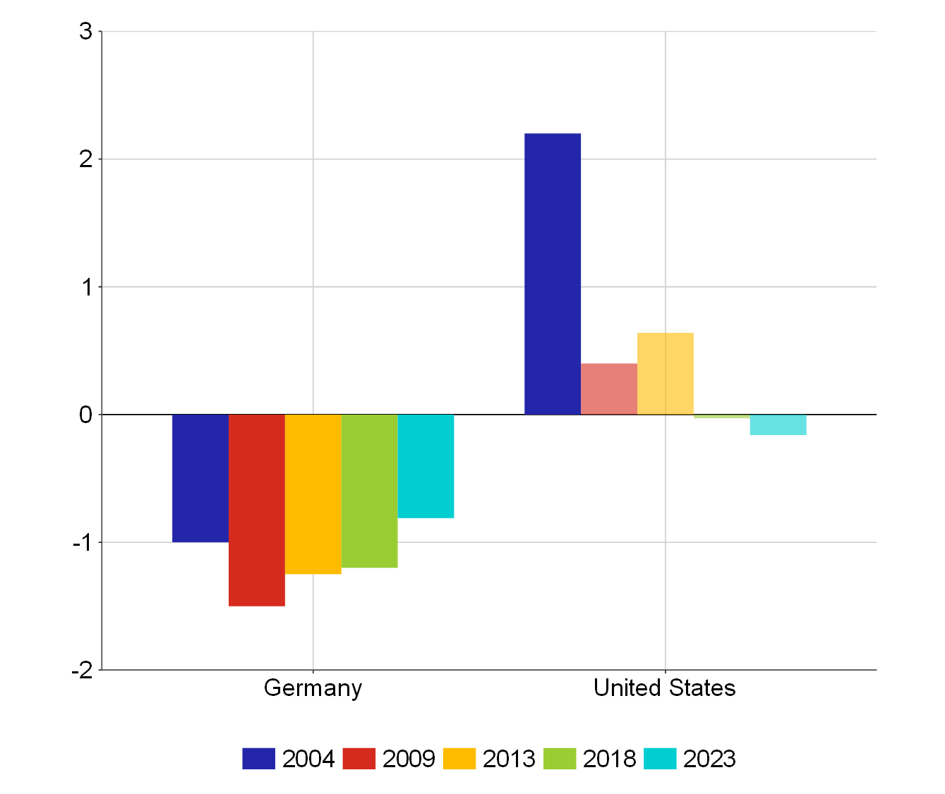We will use a cointegration analysis to determine the impact of investment outflows on domestic investment activity. The ARDL model (Pesaran et al., 2001) is a suitable tool for estimating the long-run relationship between the two variables.[6] Significant capital outflows have been recorded in both the USA and Germany since the 1970s. In both cases, the results of a cointegration analysis support the hypothesis of a long-term statistically significant relationship between capital outflows and domestic investment activity in all the time periods under review.[7] This relationship is measured by a multiplier, which expresses how much domestic investment changes in the longer term as a response to a capital outflow (Chart 2). The long-term multiplier has a negative value of -1 for Germany. This means that the outflow of FDI totalling 1% of GDP in the longer run is accompanied by a decline in domestic investment of 1% of GDP as well. In the case of the United States, the long-term coefficient is positive at 2.2. This means that FDI outflows of 1% of GDP in the USA lead to an increase in domestic investment of 2.2% of GDP. Despite the strong cointegration relationship between the two variables, which persisted until 2023, the long-term multiplier in the USA gradually decreased, to the point it became statistically insignificant. This may indicate changes in the nature of outgoing investment at the start of this century. Newly outgoing capital may be ceasing to be an investment stimulus. In the case of Germany, by contrast, the long-term multiplier has remained close to -1 over the entire period monitored. The outflow of capital from Germany has thus long been accompanied by lower domestic investment activity.[8] The different impacts in the two countries under examination may be based on different motives behind foreign investment. A dataset regularly compiled by the OECD containing information on the activities of multinational enterprises (MNEs)[9] and their integration into global value chains can provide us with a better view into outgoing investments.[10]