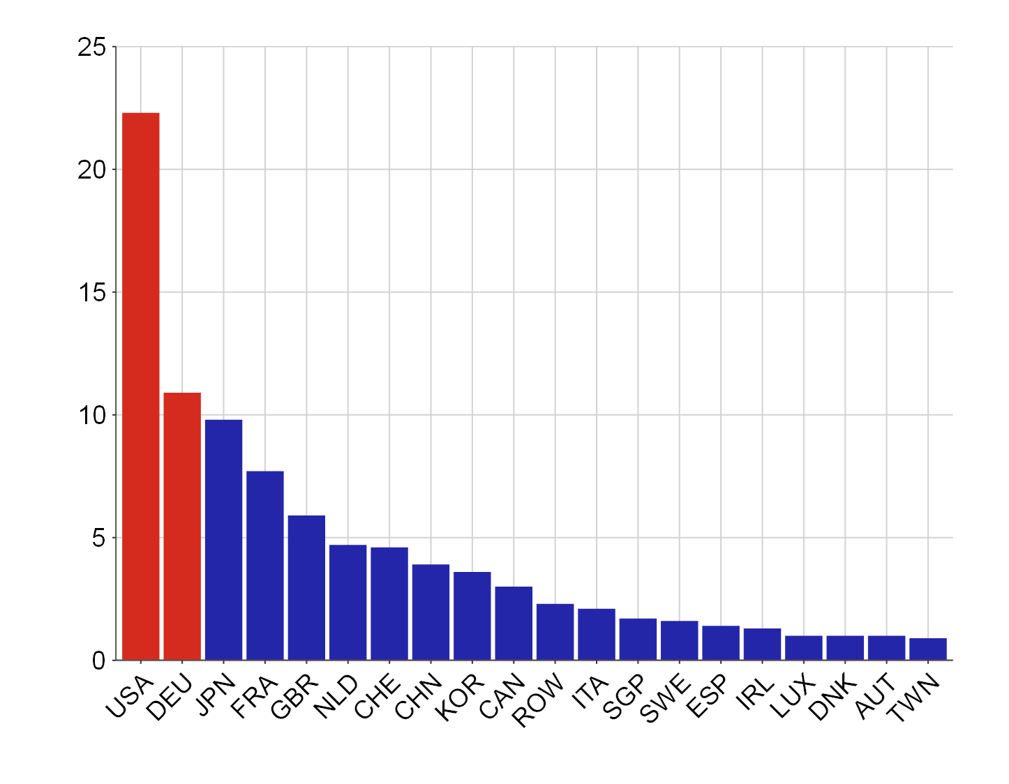 The higher participation of Germany in horizontal investment is also supported by data that monitor the added value of domestic multinational enterprises. For the domestic economy, if higher parts of the production chain or final stages of production are moved to another country due to FDI, this means a loss of high-value-added production. In the USA, MNEs add up to 50% of their value to their products, whereas in Germany this share is only 36%. Chart 5 provides a cross-section of selected industries. It is clear that while the United States holds a high share of added value in key areas such as the production of pharmaceuticals, computers and electronics, Germany lags well behind. The biggest difference is in the production of computers and electronics – US multinational enterprises add 75% of the total product, while in Germany it is only 47%. By contrast, Germany adds a higher share in the manufacture of motor vehicles, but the difference is not very high.