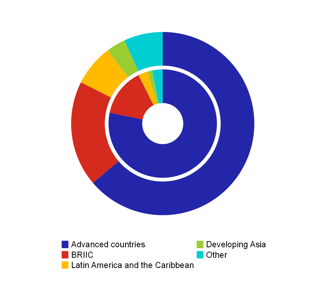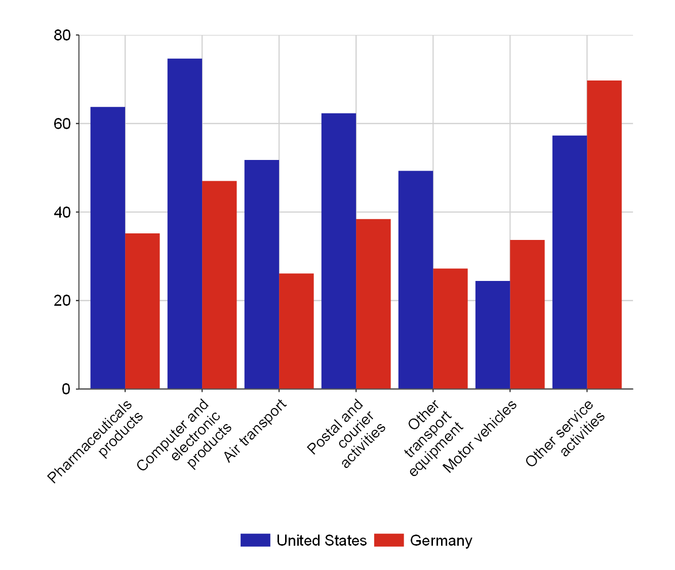 Relatively, US firms target emerging markets more. Non-tradable goods account for a higher share of foreign production than in comparison with Germany. A geographical breakdown gives us another view of the different structure of cross-border investments in the United States and Germany. The share of foreign branches’ production shows us that US companies are relatively more concentrated in emerging economies, while Germany invests more in the EU and other advanced economies (Chart 6). Investment in emerging regions, such as BRIIC countries,[14] South-East Asian countries and Latin America, offers a wealth of natural resources, low production costs and higher growth potential, allowing US firms to strengthen their global competitiveness and generate additional profits that can be reinvested in the domestic economy. US companies also focus more on investments in the services sector, which are generally less tradable (and therefore tend to suppress domestic exports less), in the framework of which production is concentrated more in areas that provide higher knowledge spillover effects (information and communication, professional and scientific activities) (Chart 7).