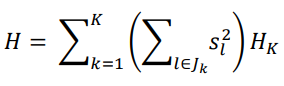 where is the share of the l-th partner in total trade. Thus, the Herfindahl–Hirschman Index H over the finer set I is the weighted sum of the Herfindahl–Hirschman Indices Hk over the sets Jk, where the weights are given by the sum of the squares of the share of the individual blocs. If a country mainly trades with countries in a particular bloc – let’s say Jk – the weight of that bloc