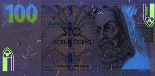 - fibres 6 mm long, invisible in daylight, fluoresce blue; visible fibres fluoresce yellow; left-hand part of portrait (heraldic description), name KAREL IV., upper part of denomination on coupon and engraver’s name fluoresce blue; lower half of denomination on coupon and blind code fluoresce green; ornaments in form of stylised Gothic window fluoresce green in lower left and upper right parts