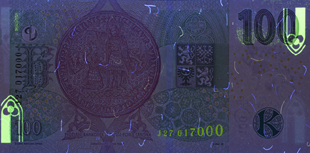 - fibres 6 mm long, invisible in daylight, fluoresce blue; visible fibres fluoresce yellow; horizontal series mark and banknote numbers fluoresce green; ornaments in form of stylised Gothic window fluoresce green in lower left and upper right parts