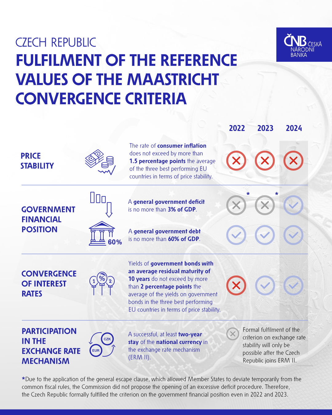 The assessment covers three areas. The first assesses compliance with the nominal (Maastricht) convergence criteria, which are a necessary but not sufficient condition for joining the euro area. These criteria set fiscal and monetary reference values, compliance with which is meant to reduce the risks and costs associated with the absence of an independent monetary policy. Successful compliance with the relevant criteria should also mitigate risks to stability and prevent the emergence of imbalances in the monetary union. In 2024, the Czech Republic fulfilled the interest rate convergence criterion and the government financial position criterion. However, it did not meet the criterion on price stability, due to a low reference value and persisting elevated growth of service prices in the domestic economy. The Czech Republic is formally non-compliant with the exchange rate fluctuation criterion, as it is not part of the ERM II exchange rate mechanism.