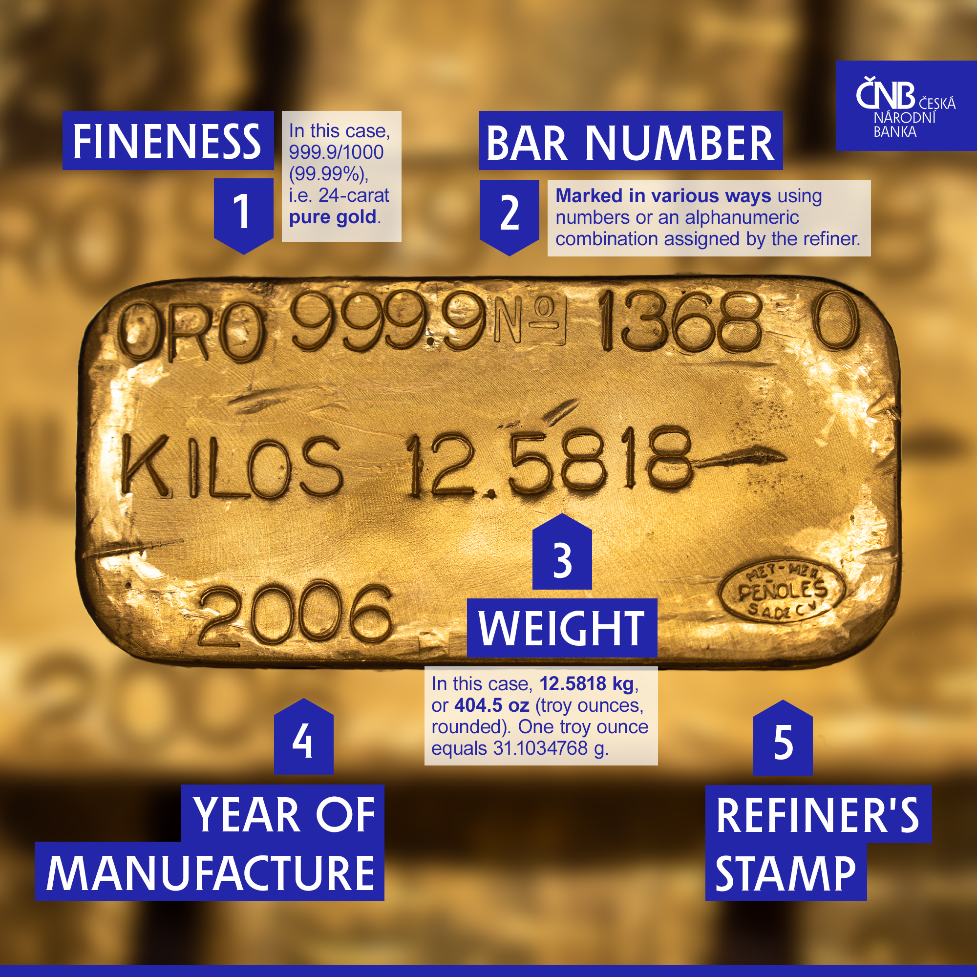 These bars have a minimum fineness of 995 parts per thousand and a weight of 350–430 troy ounces (about 10.9–13.4 kg), most often 400 troy ounces (about 12.4 kg). Each is marked with the bar number, the fineness, the year of manufacture and the refiner’s stamp. The most significant refiners are included on the LBMA’s Good Delivery List. There are only a few dozen of these internationally recognised refiners worldwide.