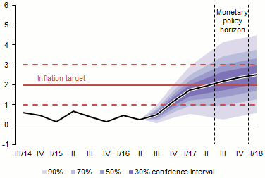 The fan chart captures the uncertainty surrounding the future evolution of consumer price inflation. The darkest band around the centre of the forecast shows the developments that can occur with 30% probability. The widening bands successively show the developments occuring with the probability of 50%, 70% and 90%.