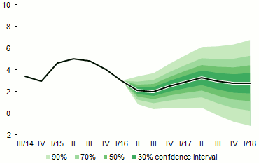 The fan chart captures the uncertainty surrounding the future evolution of the seasonally adjusted GDP growth. The darkest band around the centre of the forecast shows the developments that can occur with 30% probability. The widening bands successively show the developments occuring with the probability of 50%, 70% and 90%.