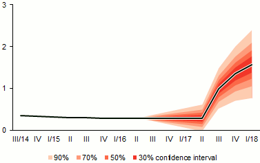 The fan chart captures the uncertainty surrounding the future evolution of interest rates. The darkest band around the centre of the forecast shows the developments that can occur with 30% probability. The widening bands successively shows the developments occuring with the probability of 50%, 70% and 90%.