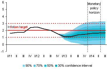The fan chart captures the uncertainty surrounding the future evolution of monetary-policy relevant inflation. The darkest band around the centre of the forecast shows the developments that can occur with 30% probability. The widening bands successively show the developments occuring with the probability of 50%, 70% and 90%.