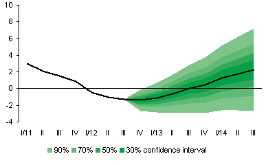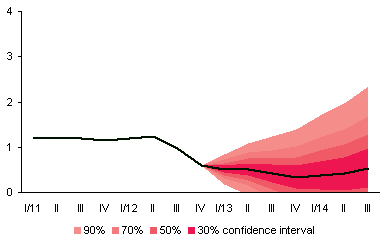 The fan chart captures the uncertainty surrounding the future evolution of the seasonally adjusted GDP growth. The darkest band around the centre of the forecast shows the developments that can occur with 30% probability. The widening bands successively show the developments occuring with the probability of 50%, 70% and 90%.