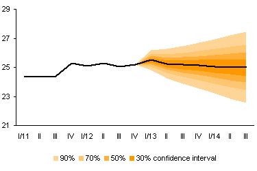 Fanchart reflects the uncertainty in the future development of exchange rate. The darkest band around the central projection corresponds to the development in 30% of possible scenarios of future. Wider bands correspond to the development in 50%, 70% and 90% of possible scenarios, respectively.