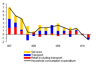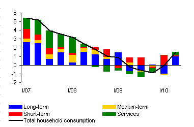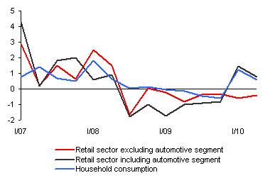Household consumption according to the national accounts broken down by durability shows that the structure of household consumption reported by the CZSO in the last three quarters is roughly in line with retail sales including the automotive segment. The sharp increase in the automotive segment in the national accounts data is probably reflected in durable goods, which made a significant positive contribution at constant prices in 2010 Q2, thereby helping household consumption to extricate itself from year-on-year decline. The contribution of non-durable goods in the first two quarters of this year was also significant, but their retail sales are still showing a noticeable decline.