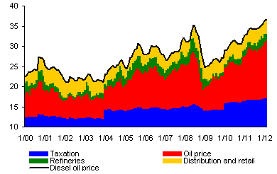 Final prices of petrol and diesel in the Czech Republic (and elsewhere) are affected by market and administrative factors. The market factors include the dollar price of oil, the koruna dollar exchange rate, refining, distribution and marketing costs, and profits of refineries, transporters and retailers. Theadministrative factors include excise duty and VAT (which is levied on the price including excise duty) and indirectly also the tightening of upper limits on the content of harmful substances, the raising of the required minimum proportions of bio-components, and the price of CO2 emissions in oil processing. Seasonal swings in demand/consumption are also relevant to the price of petrol. In the Czech Republic the seasonal effect for diesel prices is smaller, as a large proportion of diesel is consumed in freight and passenger transport, where consumption is spread more evenly (unlike in countries where light fuel oils are also largely used for heating). On the other hand, the price of diesel is more closely connected with the phase of the business cycle because of freight transport.