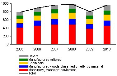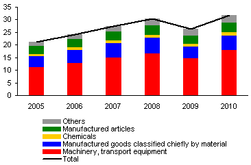 The strong link between German and Czech exports is also reflected in their structure. Machinery and transport equipment is the largest item of German exports, accounting for around 50% of the total (see Chart 2). Goods exports from the Czech Republic to Germany have a similar structure and are also dominated by machinery and equipment (see Chart 3).