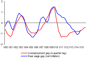 The cycli /en/monetary-policy/.galleries/inflation_reports/2015/2015_II/boxes_and_annexes/zoi_2015_II_box_2_graf_1_en.gifcality of the real wage gap2 and the unemployment ratedisplayed marked correlation in the past. However, the fall in economic activity during the economic crisis led to stronger adjustment of the labour market via falling employment (and hence also growth in the unemployment rate) than via real wages. Amid a marked slowdown in nominal wage growth, the real wage rigidity was also due to a sizeable temporary decline in net inflation in 2009. The subsequent renewed growth in employment and the related gradual closure of the unemployment gap was accompanied by only moderate growth in the average nominal wage amid renewed positive net inflation. This led to the real wage gap turning negative in 2012. The real wage gap did not start to narrow until the second half of 2014 (see Chart 2).