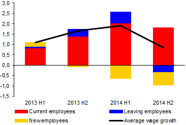 3 Leaving employees also have significantly lower wages than current employees (around 10% lower). However, their average wage growth usually exceeds that for current employees. The number of leaving employees more than doubled compared to the previous period. This caused their contribution to average wage growth in 2014 H1 to turn negative.