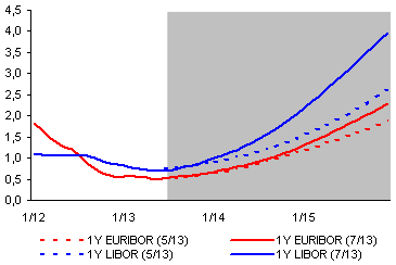The May FOMC meeting and a number of statements made by leading representatives of the US central bank led to widespread speculation that the Fed would moderate the pace of its bond purchases soon. This resulted in a surge in bond yields globally, while stock markets declined and the currencies of emerging economies weakened. In particular, long-term interest rate outlooks were revised, but a correction occurred in late June and bond yields edged down again. In addition, some Fed representatives quelled the speculation by stating that the retreat from quantitative easing depended on the US growth outlook. Nevertheless, the implied outlook for EURIBOR and LIBOR rates remains above the path expected by the markets in May, with the shift being particularly visible for dollar LIBOR rates (see Chart 1). The correction was more pronounced in the euro area, primarily as a result of the ECB’s communication following the June meeting. The ECB announced that monetary policy would remain accommodative for as long as necessary and key interest rates would remain at present or lower levels for an extended period of time (“forward guidance”). On the Czech financial market, these factors were also reflected mainly in medium-term and long-term rates, whereas the short-term rate outlook increased only slightly.
