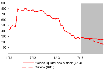In June 2013 the market was still expecting excess liquidity to fall below EUR 200 billion by the end of this year, but in July the outlook shifted slightly upwards. This was mainly caused by ECB communications stating that monetary policy would remain accommodative for an extended period of time. By the ECB’s estimation, market rates will stay only slightly above its deposit rate if excess liquidity is between EUR 100 and 200 billion.