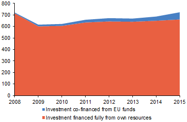 Investment by non-financial corporations is dominated by investment financed fully from own resources, but the proportion of investment financed from EU funds has increased
