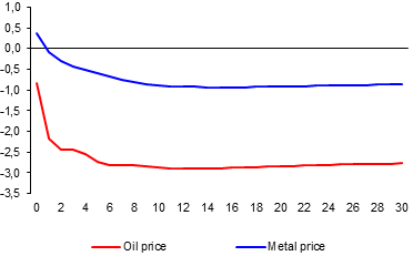 The simulated shock causes oil prices to fall by almost 3%, while the long-run decline in metal prices is almost 1%