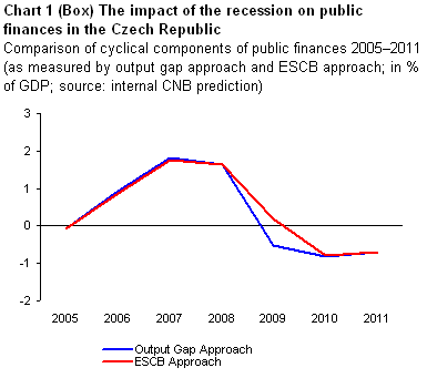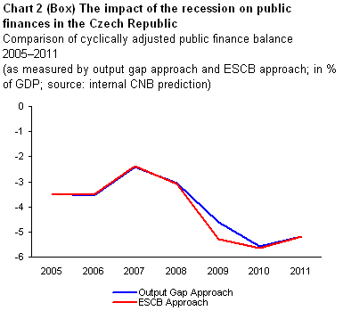 Czech public finances have come under significant pressure as a consequence of the ongoing economic crisis. Public budgets have not been affected by bail-out operations in the banking sector, as domestic financial institutions did not get involved in toxic asset operations. However, several anti-crisis budget measures have been adopted in order to mitigate the impacts of the economic crisis. These measures are largely focused on bolstering aggregate supply (a reduction in employers’ social security contributions, accelerated depreciation, etc.) and – together with measures adopted previously as part of a public finance reform – will ultimately lead to a decline in budget revenues (i.e. to wider public finance deficits). The global financial and economic crisis has also led to a rise in risk premia on financial markets, including in the Czech Republic. This has resulted in an increase in budget expenditure on interest paid on government bonds. Moreover, during economic downturns, public finances are also significantly affected by the action of built-in stabilisers, which automatically reduce tax revenues and simultaneously increase certain budget expenditures. While the figures for actively planned anti-crisis measures are known in advance, the magnitude of the impact of the decline in economic activity on public finances needs to be quantified ex post using the cyclical component of the budget balance.