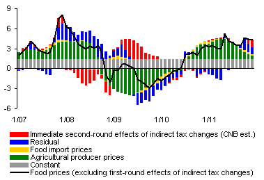 The tax changes included, among other things, an increase in the reduced VAT rate from 10% to 14% as of 1 January 2012. The effect of this change on consumer prices was first incorporated into the CNB’s macroeconomic forecast in Inflation Report III/2011, where it was described in Box 1 The impacts of changes to VAT rates on the budget and inflation and their components in 2012 and 2013. The increase in food prices due to the VAT changes at the start of this year implies a first-round effect on inflation of 0.6 percentage point. According to the forecasts in Inflation Reports III/2011 and IV/2011, the VAT change was not expected – owing to subdued demand – to pass through to consumer prices in advance, as had happened at the end of 2007. At that time, more than half of the effect of the approved change to the reduced VAT rate from 5% to 9% as from January 2008 had passed through to food prices two months in advance. Given the different position of the economy in the business cycle and the different agricultural producer price situation compared to 2007, the potential pass-through of the higher VAT rate to food prices at the end of 2011 was considered in Inflation Report IV/2011 to be only a temporary upside risk to the forecast.