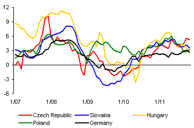 However, strong across-the-board growth in food prices in October to December 2011 suggested that the VAT change might again have passed through in advance to prices of food (excluding alcohol and tobacco, which are not affected by the recent VAT change). Seasonally adjusted food prices rose by 2.7% in 2011 Q4, with most food items recording increases. An econometric analysis reveals that the pick-up in food price inflation in this period can be explained to only a very small extent by the currently rising imported food prices or the weaker exchange rate (see Chart 1). By contrast, the effect of the high domestic agricultural producer prices in the past on food prices is fading noticeably. At the same time, a comparison of food price inflation in the Czech Republic with that in neighbouring countries shows that the Czech Republic had the fastest growing food prices at the end of 2011 (see Chart 2). This difference has no significant cause other than the VAT change. A similar difference between prices in the Czech Republic and other countries was observed in late 2007 and early 2008.