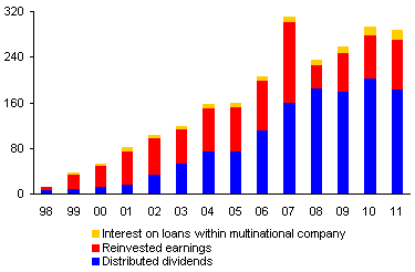 In the case of the Czech Republic, moreover, it should be noted that the potential for further privatisation FDI inflows or large greenfield FDI projects was largely exhausted a few years ago, and reinvested earnings have been the predominant source of FDI inflows into the economy approximately since 2006. Since the onset of the financial crisis, reinvested earnings have dominated the overall FDI inflow into the Czech Republic (over 90% in 2011; preliminary balance of payments data indicate the figure of 87% between January and July 2012). 1