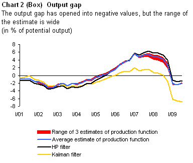 At the start of 2009, the corresponding output gap turned negative and stayed there throughout 2009 (see Chart 2). The Cobb-Douglas production function estimate indicates a not-too-wide opening of the output gap to negative values (-2% of potential output) following a previous significant overheating of the economy in 2006–2008, whereas the Kalman filter puts the current output gap almost 5 percentage points wider. The range of the individual results thus indicates a high degree of uncertainty.