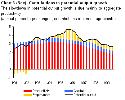 A look at the contributions of the individual production factors entering one of the variants of the Cobb-Douglas production function reveals that the slowdown in potential output growth is due to slowing growth in all input factors, but mainly in productivity (see Chart 3). The decline in employment has a lagged effect and its negative contributions to potential output growth can thus be expected to appear during 2010.