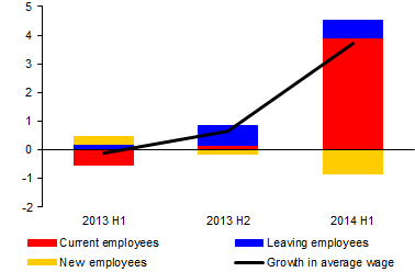 In corporations with 250 or more employees, the pick-up in wage growth in 2014 H1 was offset by a fall in wages of new employees