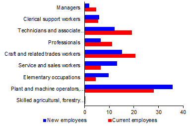 In corporations with 250 or more employees, new employees are being hired to the greatest extent in the category of plant and machine operators