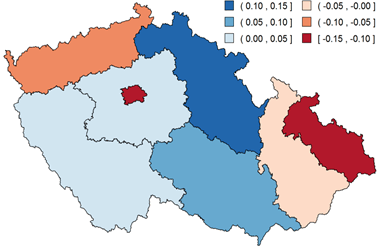 Wage growth is one of the most important indicators of the macroeconomic environment and inflation pressures in the economy. Wage data can be significantly affected over the business cycle by structural changes in the labour market. The aim of this box is to estimate the degree to which the recently observed relatively low growth rates of the average wage in the business sector may be due to these structural effects. This analysis draws on detailed data from the Average Earnings Information System (ISPV) from corporations with 250 employees or more combined with statement P304 (CZSO).1 The calculations of regional effects on the average wage work with data from the CZSO’s wage growth publications.